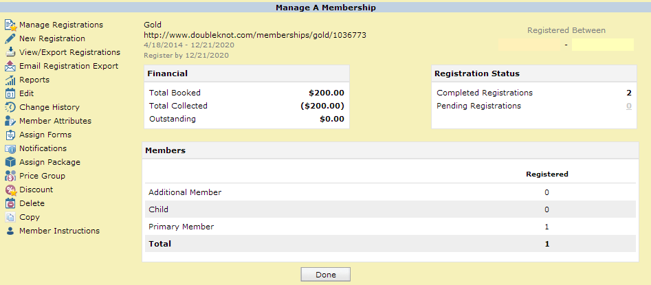 When you click a membership type, the new Manage a Membership page is displayed, which provides a snapshot of information about the membership type and contains common functions to register a new membership, view or export registrations for this membership type, set up automatic renewal notifications, and more.
